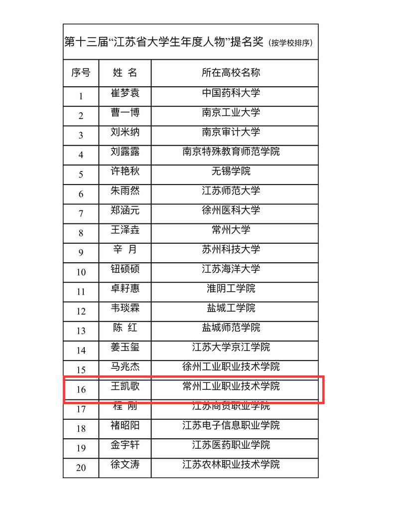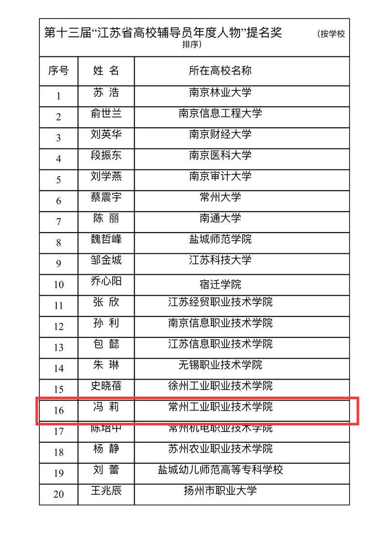 近日,江苏省教育厅公布2023年度全省高校“年度辅导员”“年度大学生”推选活动结果,常州工业职业技术学院机械与交通学院专职辅导员冯莉获2023年度省高校“年度辅导员”提名奖,数字商务学院学生王凯歌获2023年度省高校“年度大学生”提名奖。