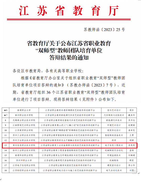 近日,江苏省教育厅公布了省级职业教育“双师型”教师团队立项名单,常州信息职业技术学院李亮亮老师领衔的电子信息工程技术教师团队申报的《工业设备维修与技改技艺技能传承创新平台》顺利通过培育单位答辩,获得江苏省职业教育“双师型”教师团队建设项目立项,并获得省级统筹财政专项资金支持,建设周期为3年。