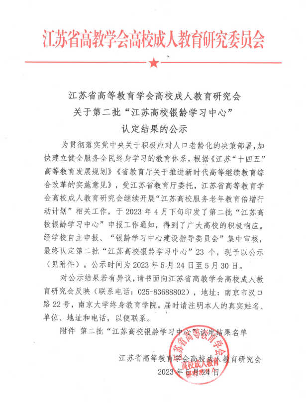 近日,江苏省高等教育学会成人教育研究会公布了第二批“江苏高校银龄学习中心”认定结果,常州信息职业技术学院成功入选第二批试点建设单位。