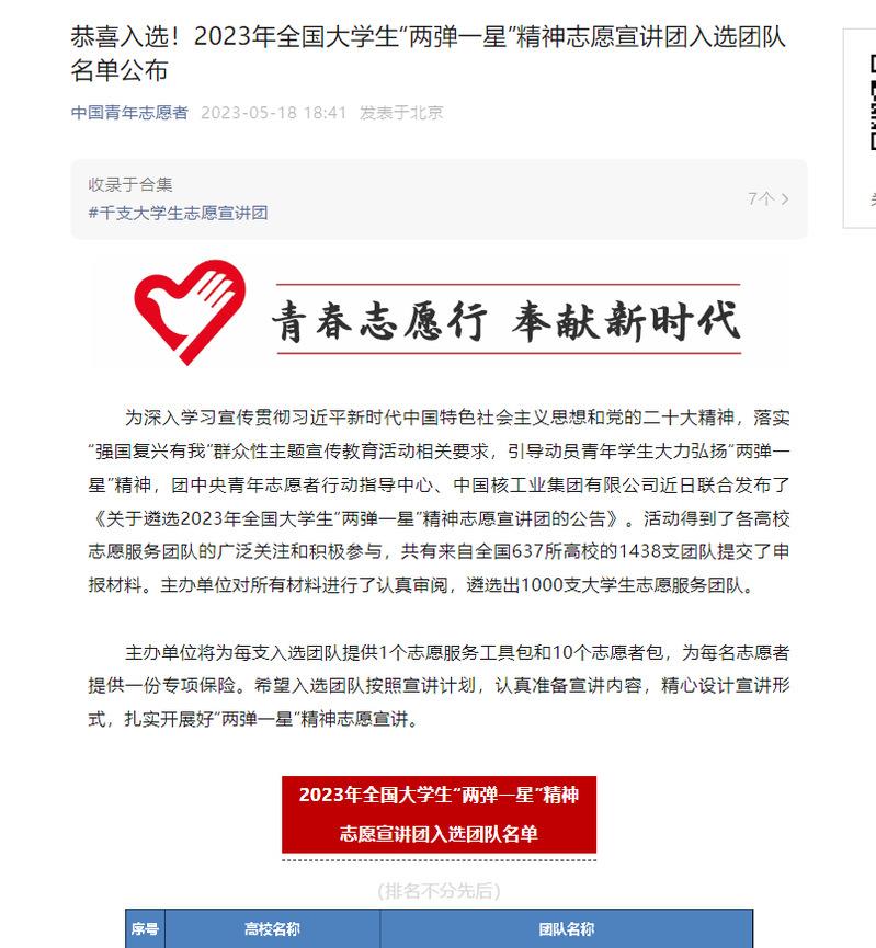 近日,由团中央青年志愿者行动指导中心、中国核工业集团有限公司联合主办的2023年全国大学生“两弹一星”精神志愿宣讲团遴选活动结果公布,常州工业职业技术学院数字商务学院的“爱心驿站宣讲团”成功入选。