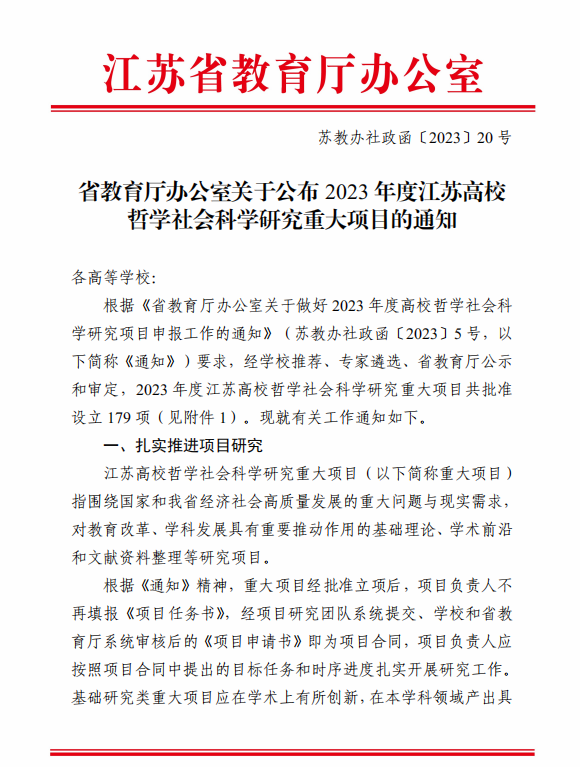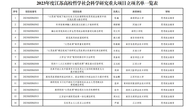 根据江苏省教育厅《省教育厅办公室关于公布2023年度江苏高校哲学社会科学研究重大项目的通知》(苏教办社政函〔2023〕20 号)文件,常州纺织服装职业技术学院马克思主义学院屈卓老师主持的《高职院校<习近平新时代中国特色社会主义思想概论>课程建设研究 》获批思政重大项目。
