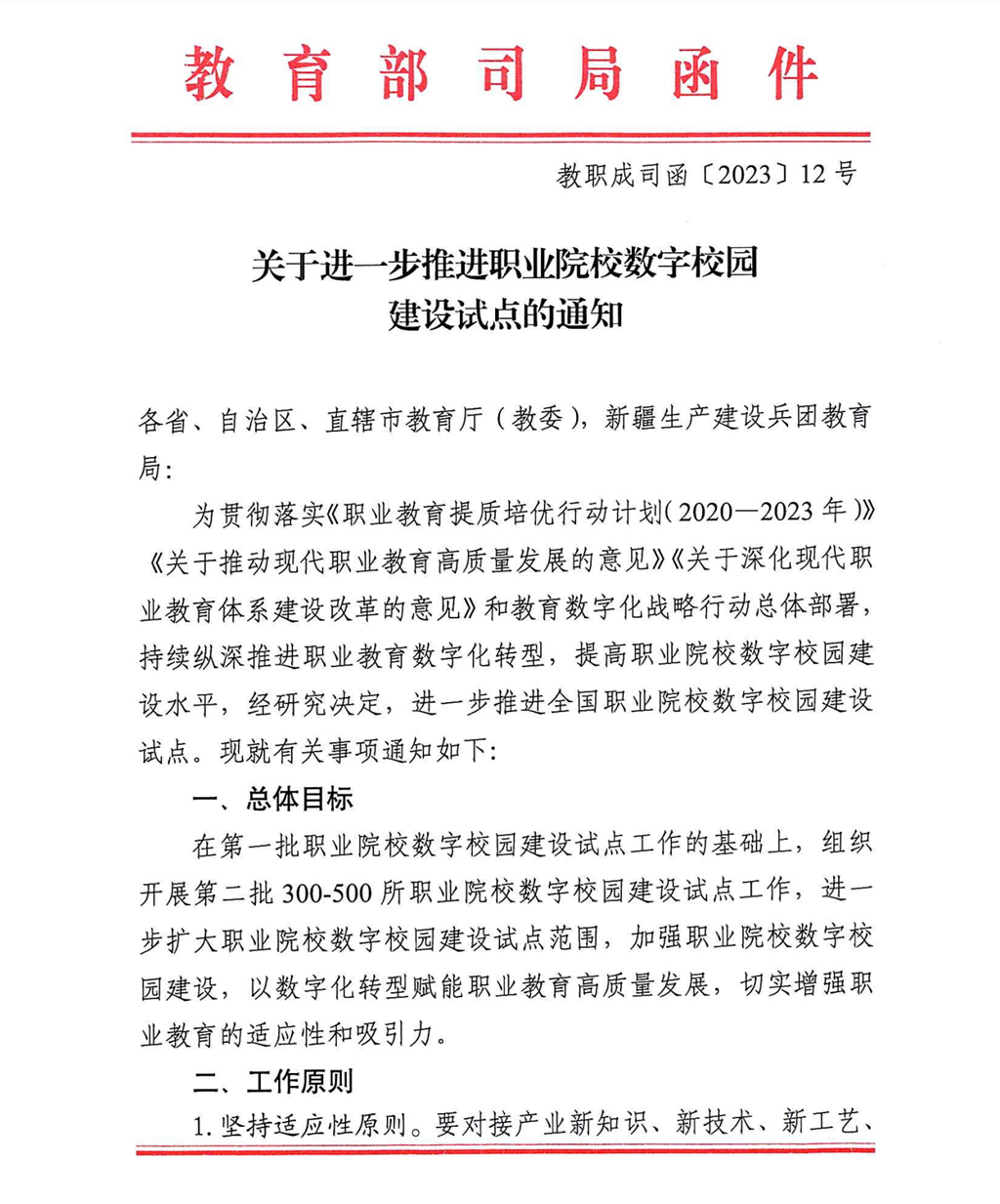 教育部第一批职业院校数字校园建设试点单位是教育部职成司在2022年4 月“职业院校数字校园建设进展情况调研”数据的基础上,从中遴选出的一批办学基础较好、信息化水平较高的学校。此次学校入选教育部第一批职业院校数字校园建设试点单位,是学校教育信息化引领学校高质量发展的一次充分肯定。