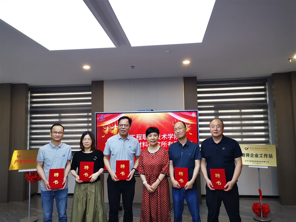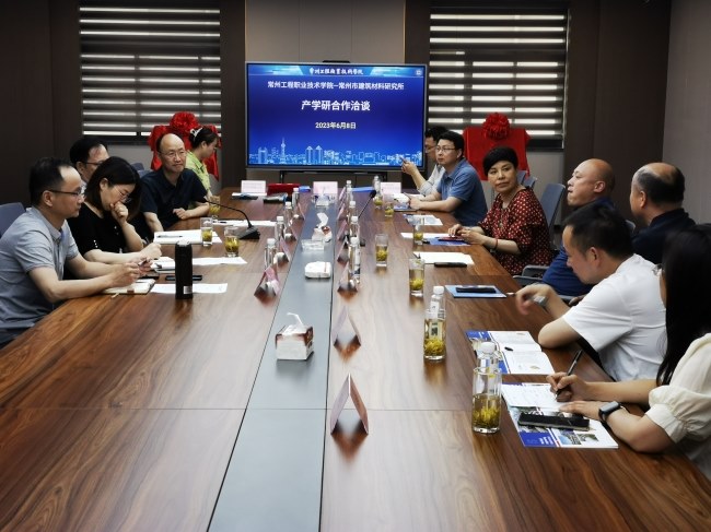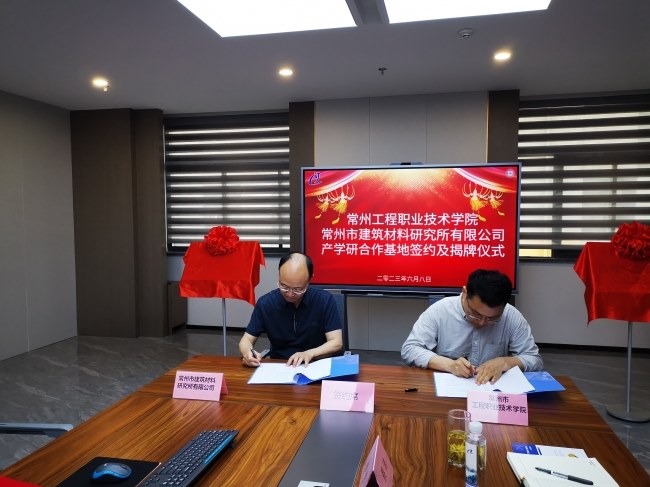 6月8日,常州工程职业技术学院与常州市建筑材料研究所有限公司共建产学研合作基地签约仪式在武进国家绿色建筑产业集聚示范区举行。常州市建筑材料研究所有限公司总顾问殷一民、总工戴小俊、副总经理鞠萍、办公室主任王亚刚和常州市节能监察中心原主任黄力行出席了仪式。学校副校长潘玉琴、产教融合办公室主任李树白、科技处副处长蔡浩、教学工作部副部长李秀华、检测学院副院长邓玉营及二级学院专业教师参会。会议由殷一民主持。