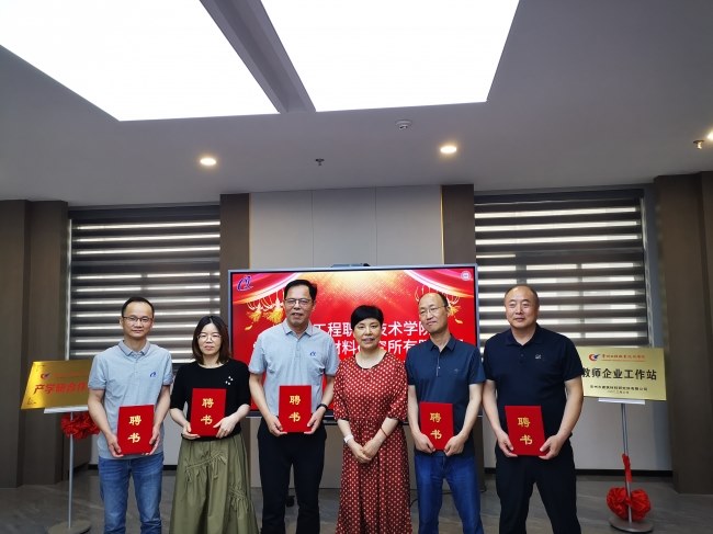 双方就产学研基地共建、科研平台共建、实习实训基地建设开展深入的交流。戴小俊、蔡浩代表双方单位签署产学研合作基地共建协议;鞠萍、李秀华为产学研合作基地揭牌;王亚刚、邓玉营共同为企业教师工作站揭牌;潘玉琴向建材所专家颁发学校产业教授聘书。