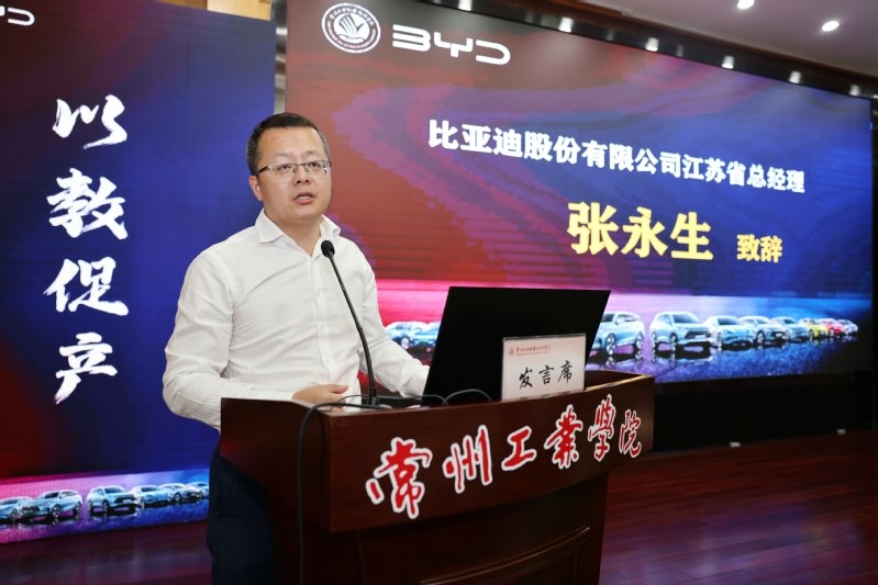 张永生对常州市科教城管委会各级领导的关心表达了谢意。他在致辞中提到,教育关乎现在,关乎未来,企业的发展重在人才。比亚迪从1995发展至今,一直秉承“造物先造人”的理念,把人才培养作为企业发展的第一要务。比亚迪将充分利用校企资源,打造优势互补、资源共享的协同创新平台,强强合作,将企业独立培养人才的模式向校企合作模式转变,为常州新能源之都建设输送源源不断的优势人才,助力打造万亿级产业集群。