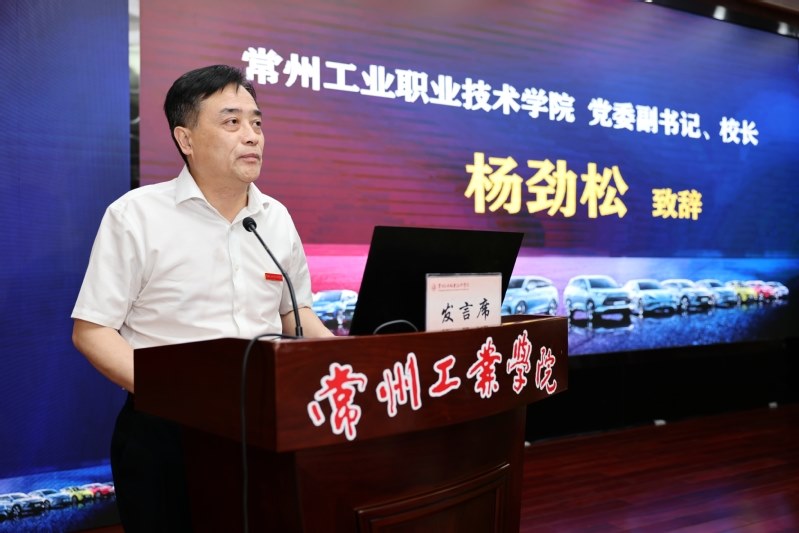 杨劲松代表全校师生对各位领导和来宾的到来表示热烈欢迎。他表示,近年来,学校以深化产教融合为重点,以科教融汇为新方向,围绕常州市“532”发展战略,助力“新能源之都”建设。工业牵头成立的常州市新能源汽车产教融合共同体,聚焦“发储送用”环节,联合新能源汽车产业链上下游龙头企业、行业协会、科研院所和相关高校,在多方面开展深度合作,打造新能源汽车“制造+服务”产业链人才培养新生态。作为全球新能源汽车行业领军企业,比亚迪产业学院的揭牌,标志着新能源汽车产教融合共同体建设迈上了新的台阶,各方将以“互利共赢、合作共赢”为原则,并肩同行,充分利用产业学院平台不断推动现场工程师人才培养模式落地生根,打造校企合作示范组合和产教深度融合共同体典范,为常州市“新能源之都”建设不断提供人才保障和智力支持。
