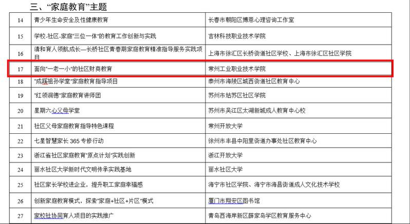 近日,从教育部职业教育与成人教育司传来喜讯,常州工业职业技术学院数字商务学院教师宋艳艳申报的项目《面向“一老一小”的社区财商教育》入选教育部社区教育“能者为师”实践创新项目。