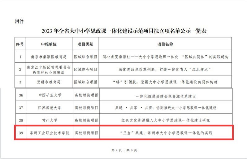 近日,江苏省教育厅公示2023年全省大中小学思政课一体化建设示范项目拟立项名单,共评出拟立项项目50项,包含区域综合项目20项、高校领衔项目30项。常州工业职业技术学院《“三金”共建:常州市大中小学思政课一体化的实践》获高校领衔项目立项。