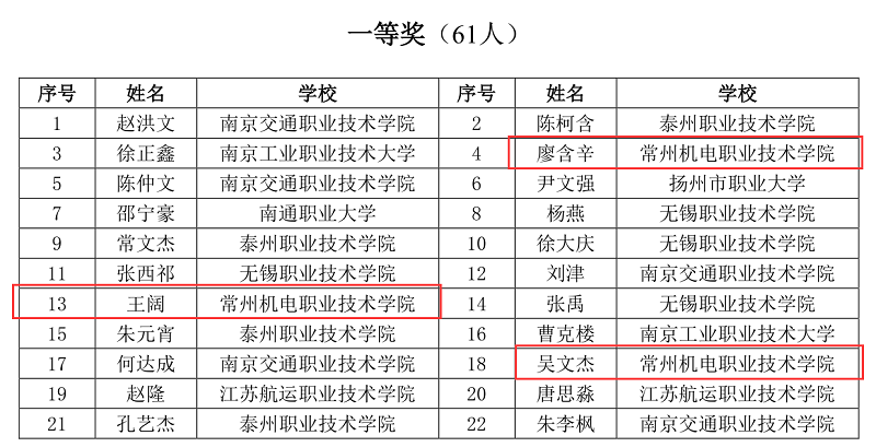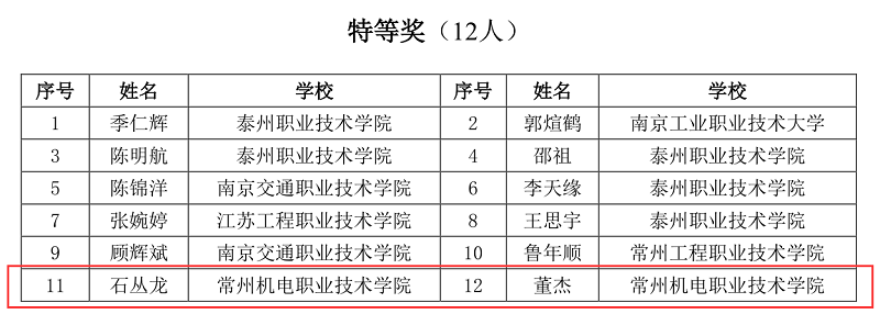 6月7日,由江苏省大学生力学竞赛组委会、江苏省力学学会、江苏省高等学校力学土建类教学指导委员会主办的第十三届江苏省大学生力学竞赛成绩揭晓,常州机电职业技术学院共有10名同学获得该竞赛的各级奖项,其中石丛龙、董杰荣获特等奖;廖含辛、王阔、吴文杰荣获一等奖;李永淇、陈丁丁、陈焱炜、孙静茹、马驰荣获二等奖。