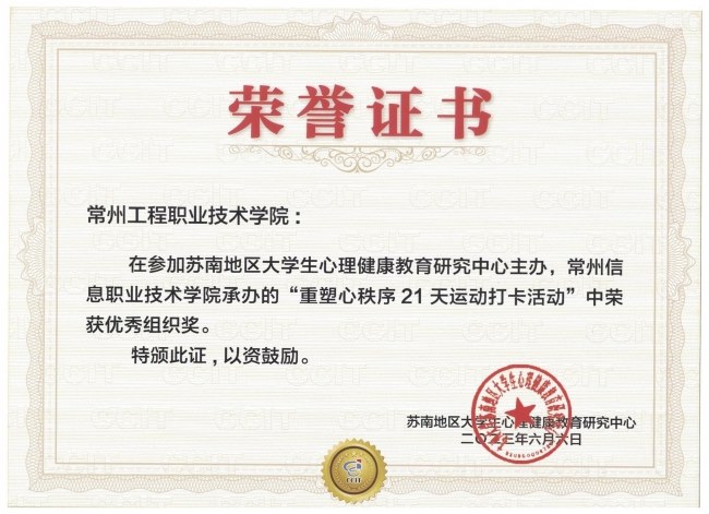 在苏南地区大学生重塑心秩序21天运动打卡活动中,共33所高校17000余人参加,13所高校荣获优秀组织奖,18位老师荣获优秀指导教师奖。学校学生积极踊跃,荣获一等奖281人、二等奖221人、三等奖88人。学校荣获优秀组织奖,袁殷红老师荣获优秀指导教师奖。