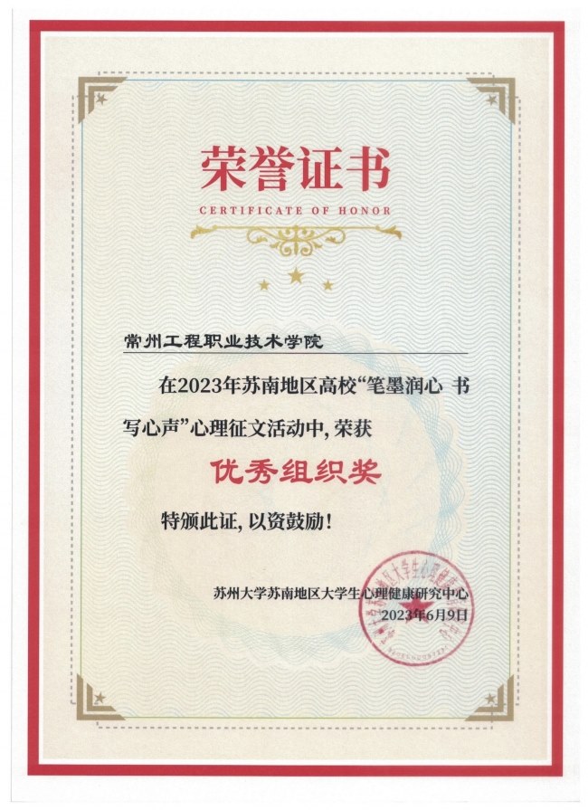 在苏南地区高校“笔墨润心 书写心声”活动中,共收到36所院校 9000余份投稿,学校参与人次高达1724,祝山川、侯翼鹏、靳亭亭三位同学荣获优秀作品奖,陈瑜、姜佳奇老师荣获优秀指导教师奖,学校荣获优秀组织奖。在苏南地区高校大学生心理漫画大赛中,王永斌、李思炜、张欣怡同学提交的作品《寻找人生目标的派大星》荣获三等奖,朱靖、刘林玉老师荣获优秀指导教师奖。