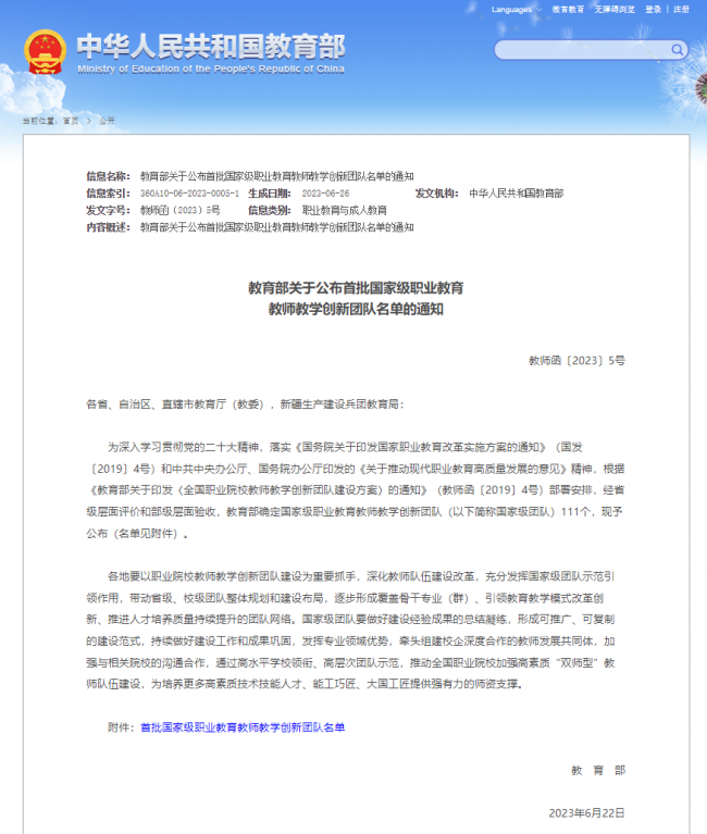 近日,教育部发布《教育部关于公布首批国家级职业教育教师教学创新团队名单的通知》(教师函〔2023〕5号),常州工程职业技术学院薛叙明教授领衔的应用化工技术团队榜上有名。