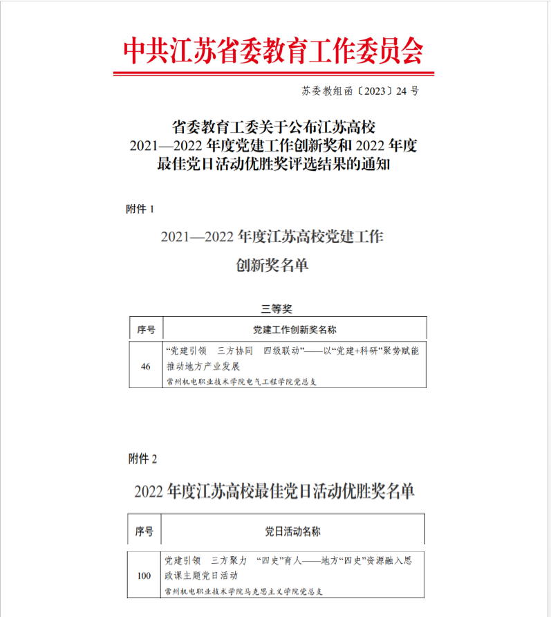 近日,江苏省委教育工委公布了江苏高校2021—2022年度党建工作创新奖和2022年度最佳党日活动优胜奖评选结果。常州机电职业技术学院电气工程学院党总支申报的《党建引领 三方协同 四级联动”——以“党建+科研”聚势赋能推动地方产业发展》荣获党建工作创新奖三等奖,马克思主义学院党总支申报的《党建引领 三方聚力“四史”育人——地方“四史”资源融入思政课主题党日活动》被评为最佳党日活动优胜奖。