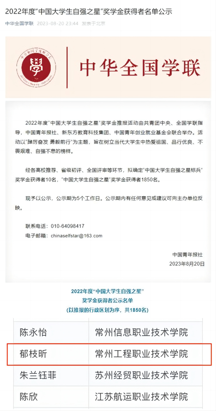 近日,由共青团中央、全国学联指导,中国青年报社、新东方教育科技集团、中国青年创业就业基金会联合举办的2022年度“中国大学生自强之星”活动的评选结果正式揭晓。经学校推荐、省级初评、全国评审等环节,常州工程职业技术学院郁枝昕同学荣获2022年度“中国大学生自强之星”。