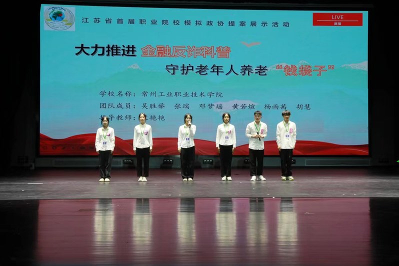 活动由理论学习、社会调研、撰写提案、集中展示、优秀提案推荐提交两会等基本环节组成。活动中,学生们以模拟政协委员的身份进行现场提案展示,并回答评委提问,视野不仅聚焦“学校小课堂”,也关注“社会大课堂”。经过激烈又紧张的展示与汇报答辩,常州工业职业技术学院金融服务与管理专业的6名同学共同提交的《关于大力推进金融反诈科普,守护老年人养老“钱袋子”的建议》,连获优秀提案奖和优秀展示团队奖,提案指导老师宋艳艳等获优秀指导教师奖。