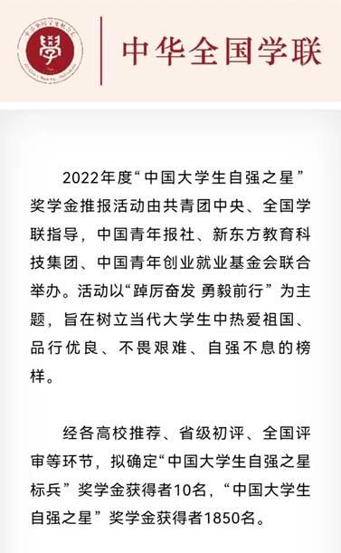 自2022年度“中国大学生自强之星”寻访活动开展以来,校团委高度重视此项活动,积极宣传、营造氛围,大力发掘各分院优秀典型案例,陈永怡同学成为“中国大学生自强之星”奖学金获得者,生动彰显了学校的育人成效和常信学子的良好精神面貌。
