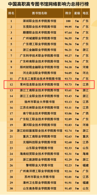 日前,由武汉大学中国科学评价研究中心联合中国科学学与科技政策研究会科学计量学与信息计量学专业委员会发布了国内首个图书馆网络影响力评价报告《中国图书馆网络影响力评价报告(2023-2024》,常州信息职业技术学院图书馆位列全国高职高专图书馆第12名、江苏省高职高专图书馆第1名。