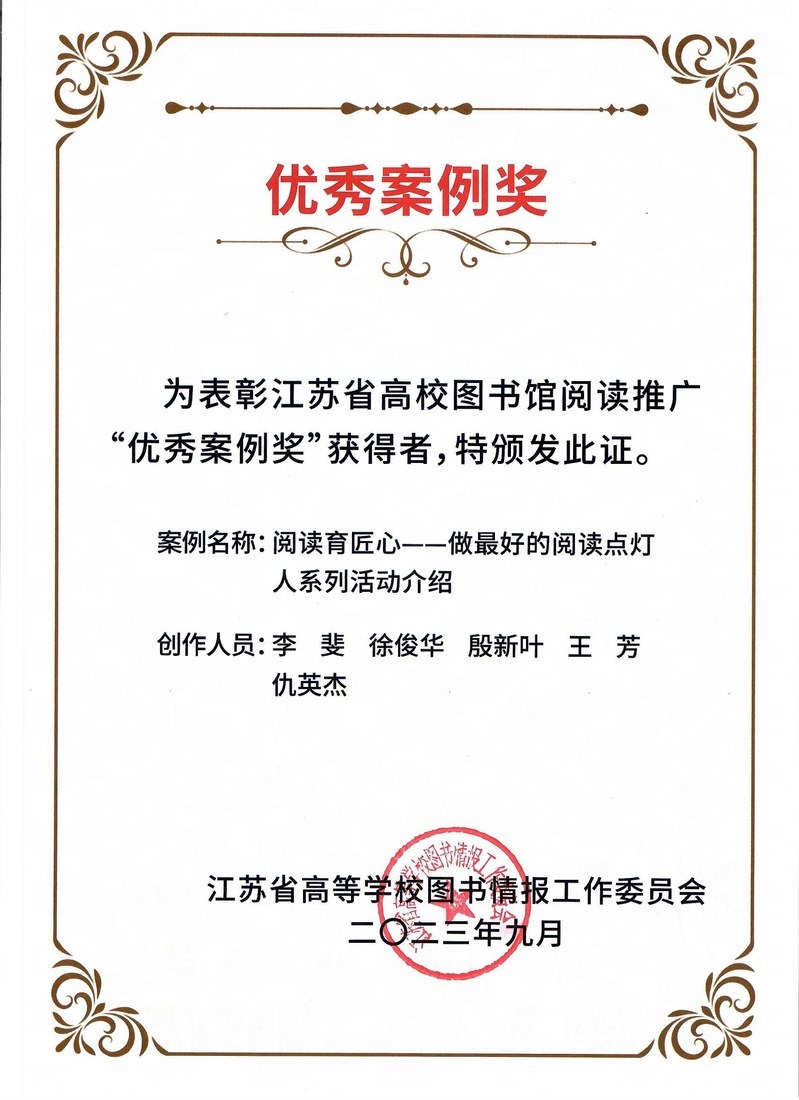 阅读推广工作优秀案例征集活动由江苏省高校图书情报工作委员会组织,于今年5月面向全省高校开展征集活动。经各高校图书馆推荐申报,江苏省高等学校图书情报工作委员会组织专家评审及专委会主任会议等三轮审议,并经各单位公示、师德师风审核合格,共评选出48项“优秀案例奖”,仅有6所高职院校获此殊荣。