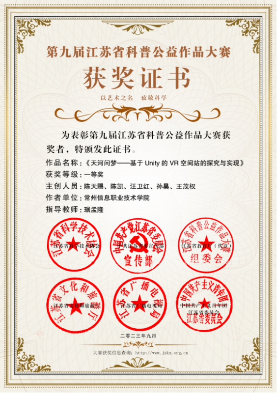 本次学校获得一等奖的作品,分别为数字创意学院动漫制作技术专业动漫技艺技能工作室创作的动画作品《梓辑之术》(科普影视类,主创:梅怡柠,指导教师:孙金山、罗青、纪元)、动漫作品《二十四节气》(科普影视类,主创:计合钰,指导教师:孙金山、石嘉忻、纪元)、虚拟现实应用技术专业创作的作品《天河问梦——基于Unity的VR空间站的探究与实现》(平面设计与空间设计类,主创:陈天赐、陈凯、汪卫红、孙昊、王茂权,指导教师:琚孟隆)。同时,学校荣获优秀组织奖,孙金山、琚孟隆、石嘉忻、纪元、罗青获优秀指导教师奖。