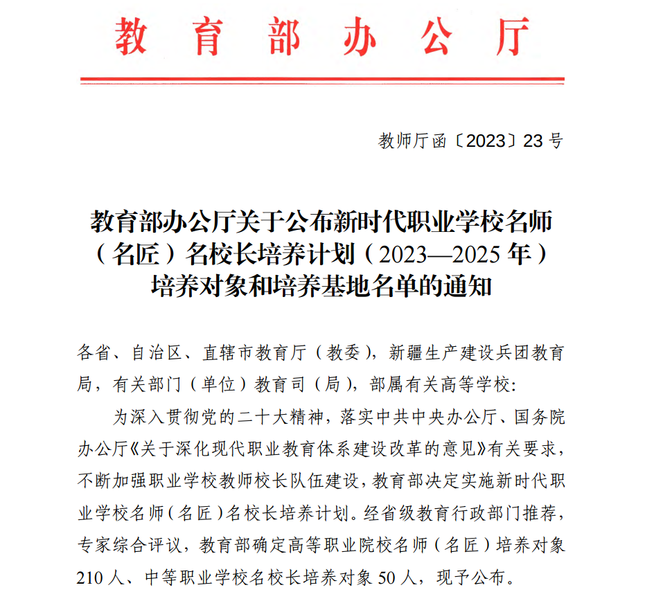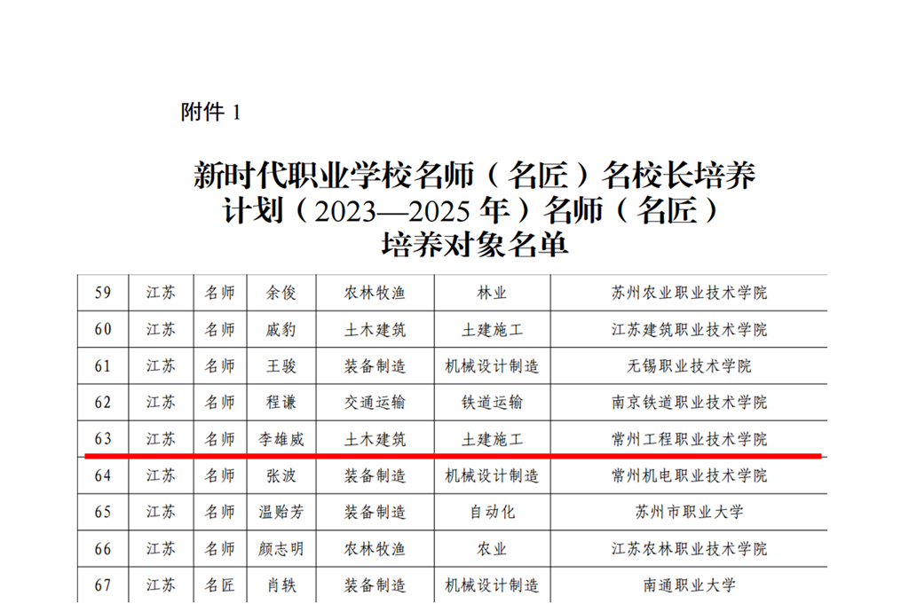 近日,教育部办公厅下发《关于公布新时代职业学校名师(名匠)名校长培养计划(2023-2025年)培养对象和培养基地名单的通知》(教师厅函〔2023〕23号),教育部确定高等职业院校名师(名匠)培养对象210人,常州工程职业技术学院李雄威教授成功入选高等职业院校名师(名匠)培养对象。