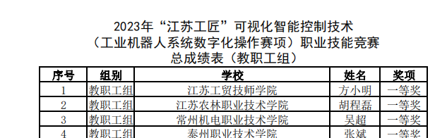 10月13日—14日,由江苏省人力资源和社会保障厅指导,中国机电一体化技术应用协会、南京凤凰在线数字科技有限公司主办,江苏安全技术职业学院承办的“江苏工匠”可视化智能控制技术“工业机器人系统数字化操作赛项”职业技能竞赛顺利举行。常州机电职业技术学院职工代表,电气工程学院教师吴超获一等奖,刘泽祥老师指导的自动化2236班学生戴和,机器人2236班学生梅峥嵘获三等奖。