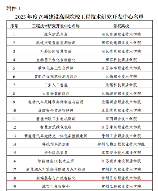 10月17日,江苏省教育厅公布了2023年度江苏省高等职业院校工程技术研究开发中心名单,常州信息职业技术学院智能装备学院与企业联合申报的《高端装备与产线智能化》喜获立项。