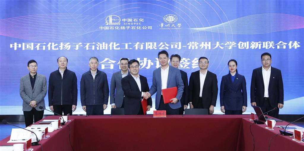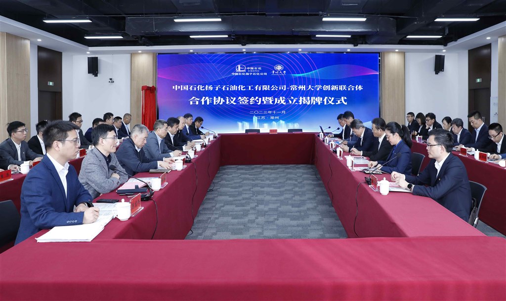 11月6日,中国石化扬子石油化工有限公司(以下简称“扬子石化”)—常州大学创新联合体合作协议签约暨成立揭牌仪式在常州召开。扬子石化董事长、党委书记顾越峰,副总经理邢建良,集团公司高级专家王振新,副总政工师兼党委组织部(人力资源部)部长(经理)潘培青,技术部副经理杨斌,研究院院长、党委书记陈韶辉,总经理办公室(党委办公室)主任陈宝兵,技术部副经理郭向前,常州大学原党委书记陈群,党委书记徐守坤,党委副书记、校长陈海群,党委常委、副校长杨琳,党委常委、副校长李亚飞,副校长晏成林出席会议,常州大学相关部门、学院负责人及有关专家参加会议。晏成林主持会议。