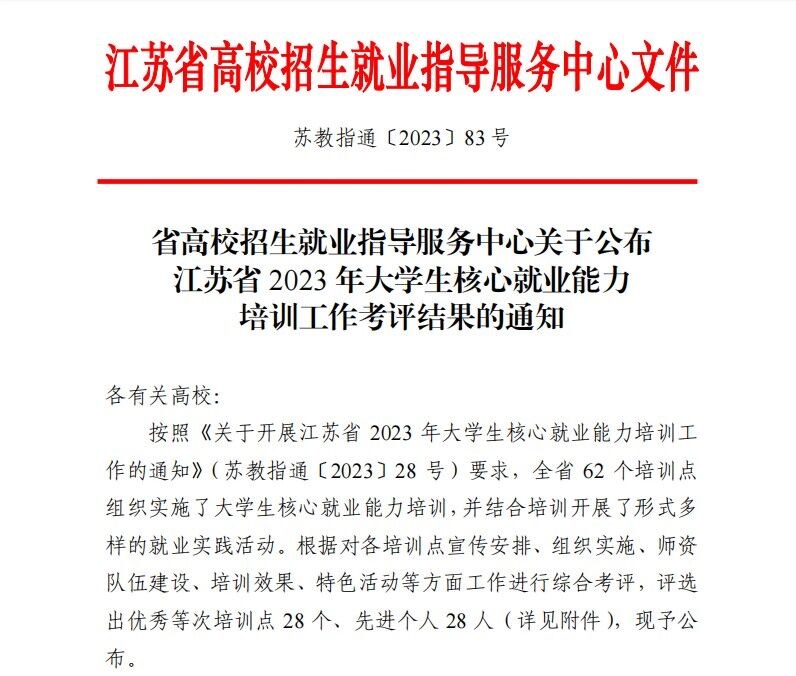 今年年初,学校对照《关于征集江苏省2023 年大学生核心就业能力培训点的通知》(苏教指通〔2023〕7 号)要求,认真组织项目申报,积极推荐师资参加研修培训。