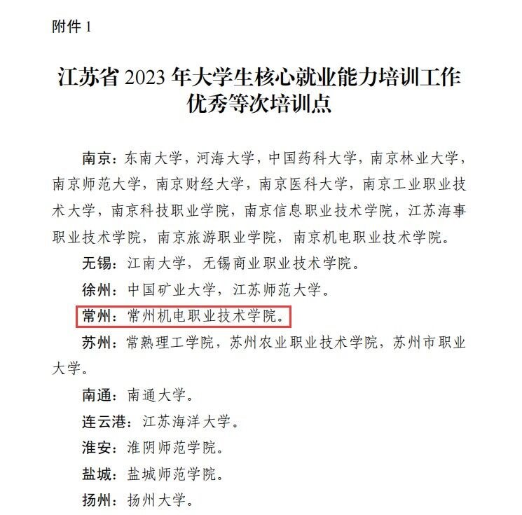 近日,江苏省高校招生就业指导服务中心印发《省高校招生就业指导服务中心关于公布江苏省2023年大学生核心就业能力培训工作考评结果的通知》(苏教指通〔2023〕2 ),常州机电职业技术学院获江苏省大学生核心就业能力培训点优秀等次。