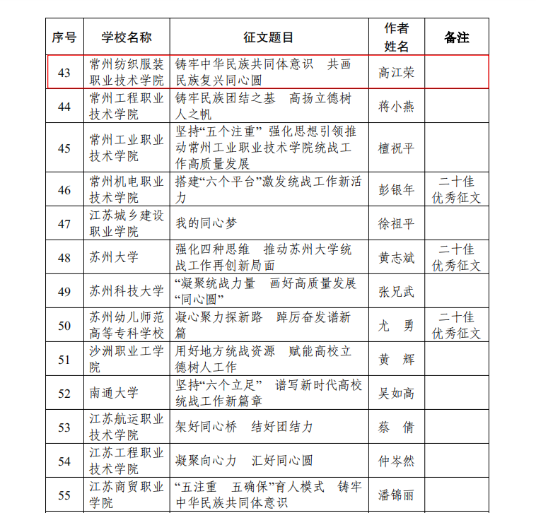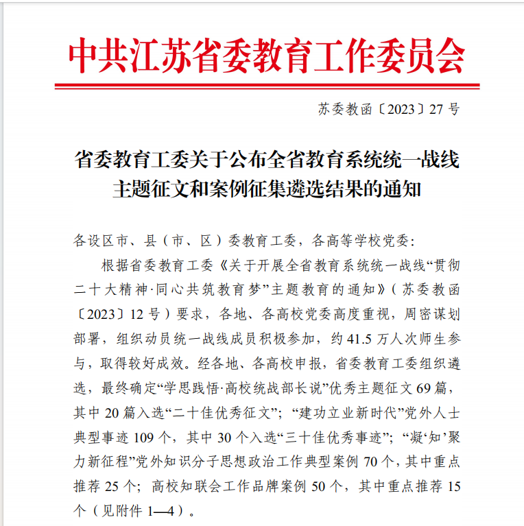为深入学习贯彻党的二十大精神和习近平总书记关于做好新时代党的统一战线工作的重要思想,落实中央和省委统战工作会议部署要求,江苏省委教育工委开展了全省教育系统统一战线“贯彻二十大精神?同心共筑教育梦”主题教育系列活动,在学校党委的高度重视和精心组织下,我校有3项作品在此次活动中获奖。