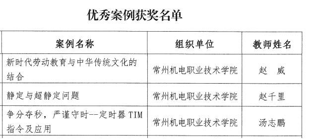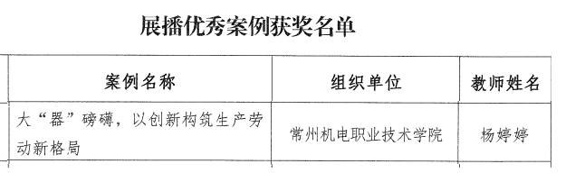 11月23日,“以劳树德 以劳启智”首届高校劳动教育示范案例征集展播活动评选结果出炉,常州机电职业技术学院杨婷婷《大“器”磅礴,以创新构筑生产劳动新格局》入选前50展播优秀案例,赵威《新时代劳动教育与中华传统文化的结合》、赵千里《静定与超静定问题》、汤志鹏《争分夺秒,严谨定时—定时器TIM指令及应用》入选优秀案例。学校获优秀组织奖。