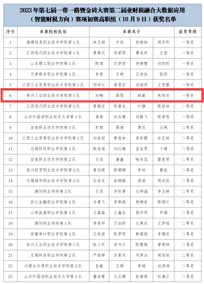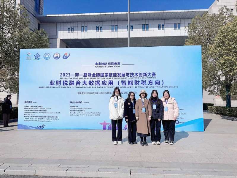 11月19日, 2023年“一带一路”暨金砖大赛之第二届业财税融合大数据应用(智能财税方向)赛项(高职组)举行全国决赛,常州工业职业技术学院数字商务学院参赛队高煜、林敏、朱雨欣、刘畅同学以初赛一等奖的身份参加全国决赛,最终获全国三等奖。