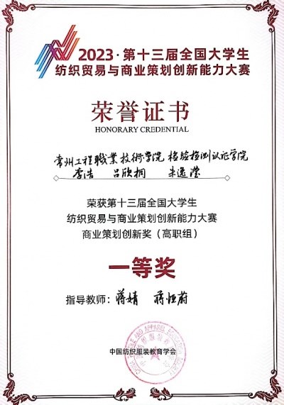 近日,第十三届全国大学生纺织贸易与商业策划创新能力大赛在东华大学落下帷幕,常州工程职业技术学院检测学院蒋婧老师、经管学院蒋恒蔚老师指导的学生团队在学校领导的大力支持下,凭借扎实的技能和过硬的个人素质,取得了优异成绩。