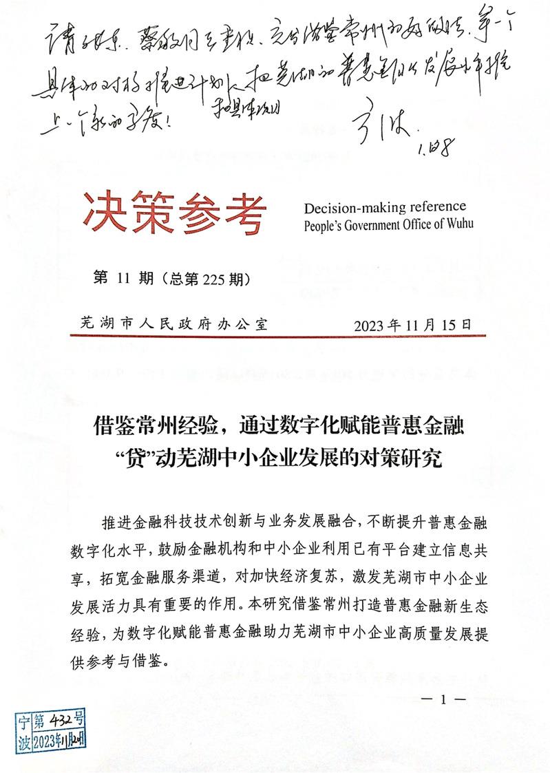 常州机电职业技术学院江苏高校哲学社会科学重点研究基地—智能制造产业经济研究院科研团队研究成果《借鉴常州经验,通过数字化赋能普惠金融“贷”动芜湖中小企业发展的对策研究》《借鉴苏州、常州经验,疫情后我市外资引进工作机遇和政策研究》分别得到芜湖市委书记宁波、市长徐志批示,两项成果分别被列入2023年第11、12期《决策参考》,报送芜湖市四大班子负责同志,市政府秘书长,市委、市政府副秘书长,并抄送至各县市区政府、开发区管委会,市各有关单位。