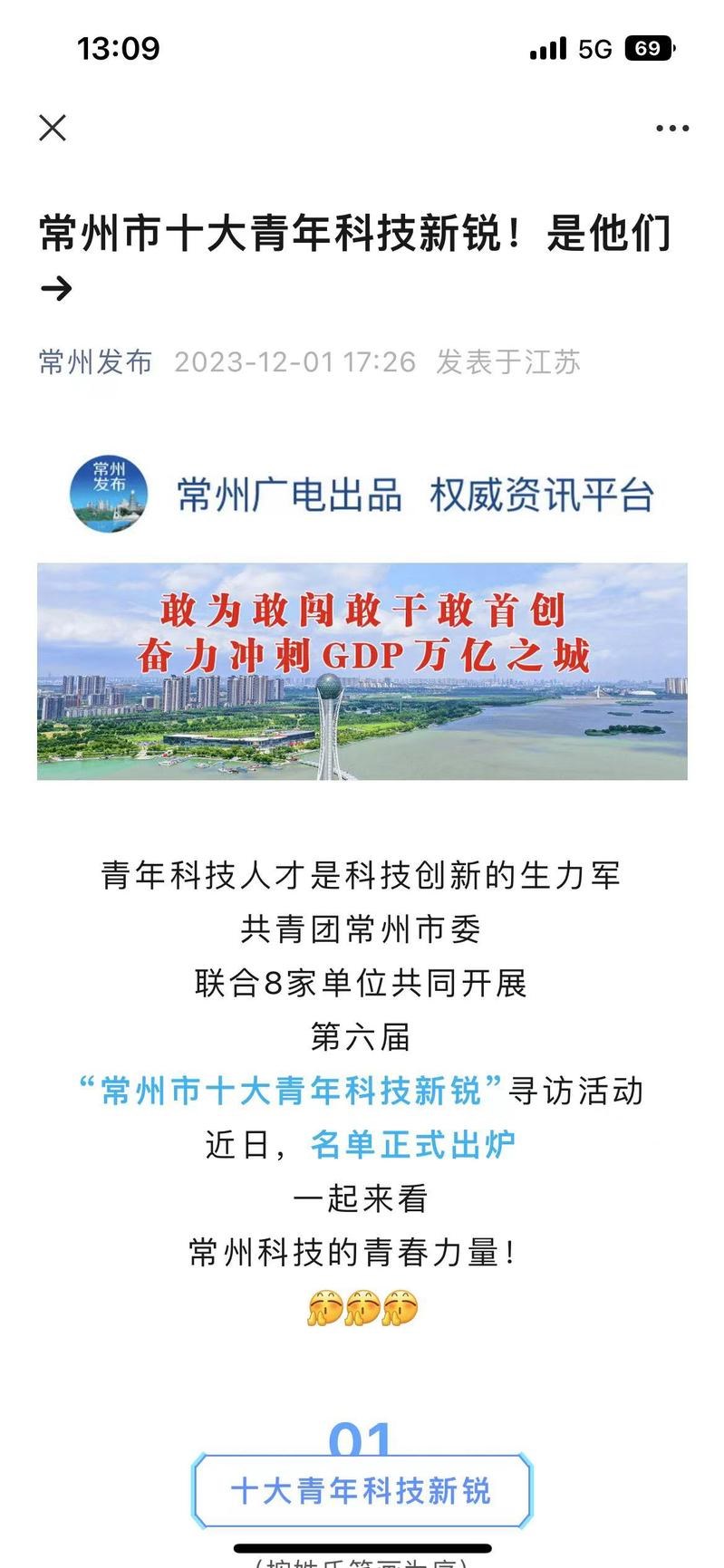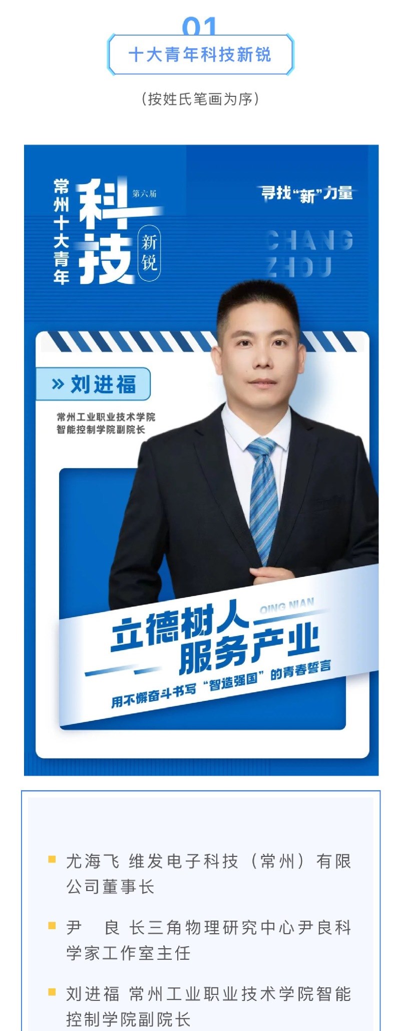 自今年9月11日以来,共青团常州市委联合8家单位共同开展第六届“常州市十大青年科技新锐”寻访活动。经过2个月的寻访和综合评定,常州工业职业技术学院智能控制学院刘进福博士获评第六届“常州市十大青年科技新锐”。