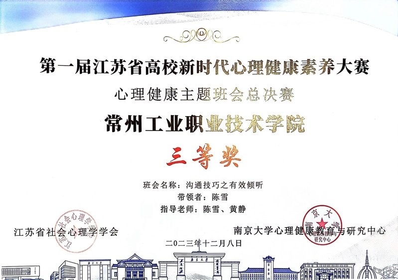 12月7至8日,“第一届江苏省新时代心理健康素养大赛”决赛在南京大学圆满落幕,常州工业职业技术学院数字商务学院辅导员陈雪荣获心理健康主题班会三等奖。