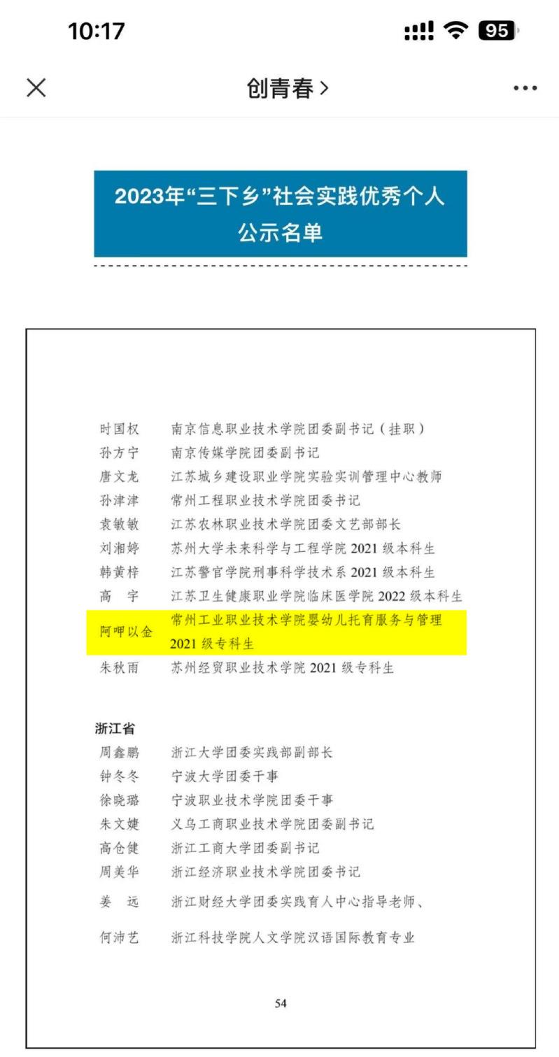 近日,团中央公布了2023年全国大中专学生志愿者暑期文化科技卫生“三下乡”社会实践活动评选结果,常州工业职业技术学院旅游与康养学院阿呷以金同学获评社会实践优秀个人。这是继去年信息工程学院“‘蚕海桑田’里的致富路——助力蚕桑村蚕桑产业升级实践团”获评全国“三下乡”社会实践优秀团队以来,学校再次被团中央表彰。