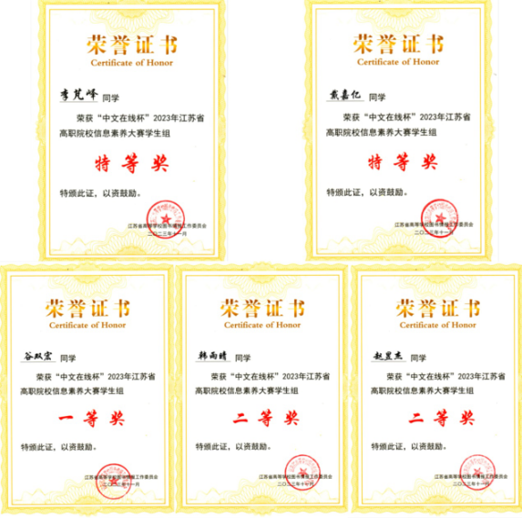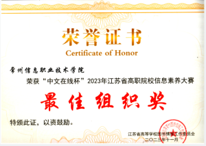 近日,2023年“中文在线杯”江苏省高职高专院校信息素养大赛顺利举行。来自全省50多所高职院校、242名选手参加了比赛。经过激烈角逐,常州信息职业技术学院5名参赛选手分别获得特等奖2项、一等奖1项、二等奖2项,学校获“最佳组织奖”。其中,李芃峄和戴嘉亿2名同学入围国赛。