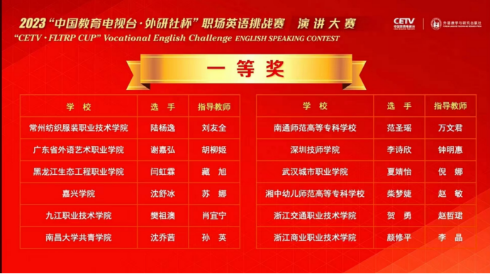 12月14日,2023年“中国教育电视台外研社杯”职场英语挑战赛全国决赛在北京圆满落幕。经过江苏省省赛选拔,常州纺织服装职业技术学院商英2331班徐菲阳、商英223本班陆杨逸从省赛中脱颖而出,分别获得代表江苏省参加全国写作大赛决赛和全国演讲大赛决赛的名额。代表江苏省参加国赛的选手共有6名,我校是唯一一所两名选手入选国赛的高职院校。在全国决赛场上,来自全国30个省、自治区、直辖市的优秀职教选手竞技语言,激荡才思,我校两位选手凭借稳定出色的发挥,双双获得全国一等奖。
