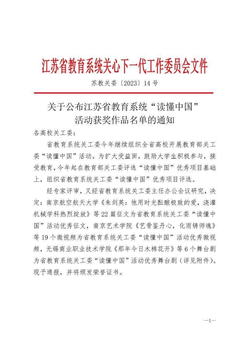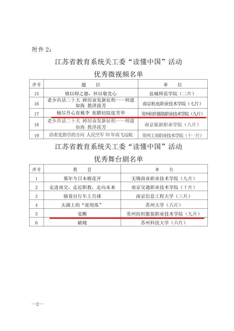 近日,江苏省教育系统关工委下发了《关于公布江苏省教育系统“读懂中国”活动获奖作品名单的通知》苏教关委〔2023〕14号,常州纺织服装职业技术学院报送的服装学院关工委制作的《倾尽丹心育桃李 躬耕纺院绽芳华》获得微视频优秀奖(全省共19个)、经贸学院关工委排演的舞台剧《觉醒》获得舞台剧优秀奖(全省共6个)。