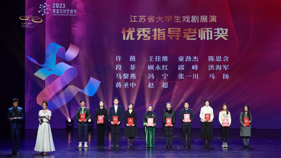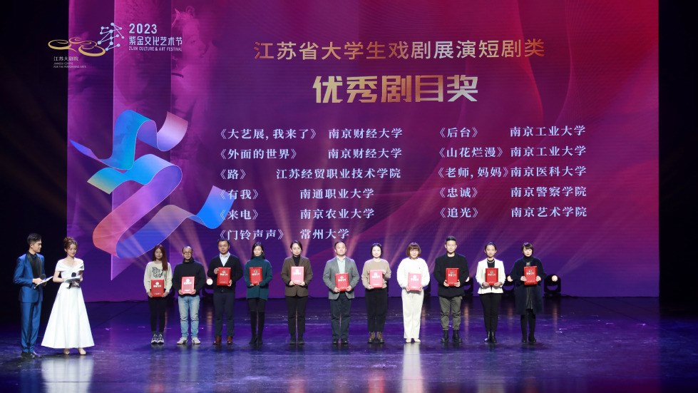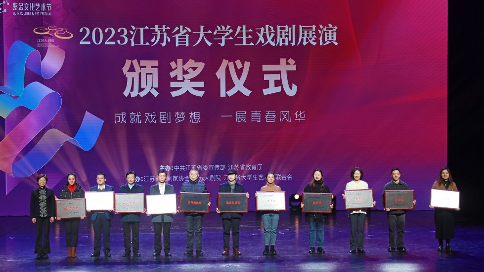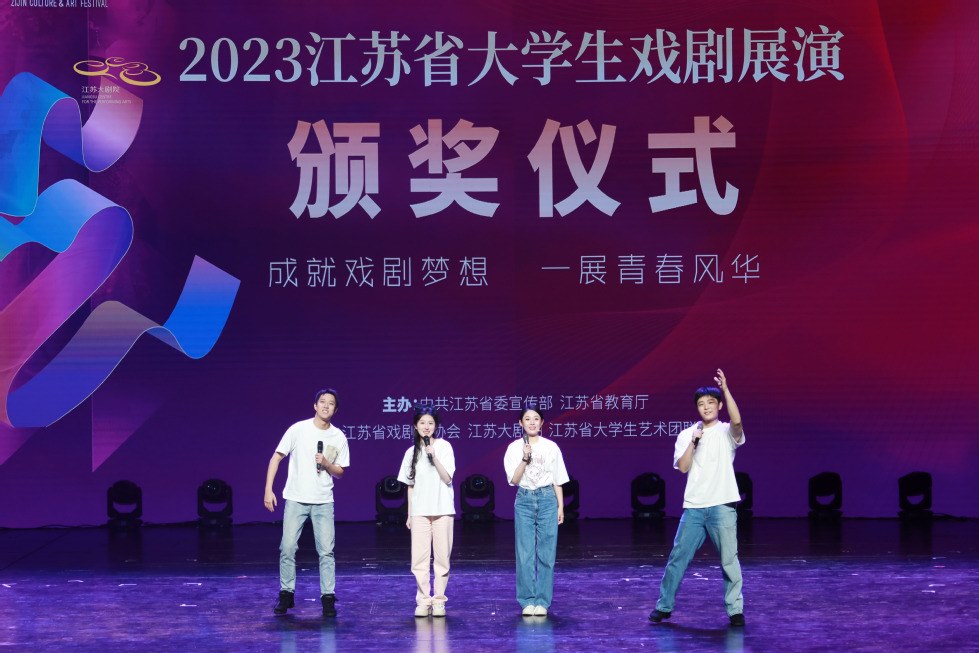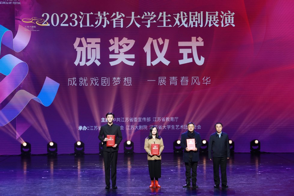 12月18日,2023江苏省大学生戏剧展演颁奖仪式在江苏大剧院举行。常州大学原创诗话剧《月亮与烟火》获长剧类一等奖,小品《门铃声声》获短剧类优秀剧目奖,常州大学荣获优秀组织奖,童劲杰、陈思含获优秀指导教师奖。江苏省委宣传部副部长徐宁、省教育厅二级巡视员李金泉、省文联一级巡视员刘旭东等领导出席活动并为获奖单位及个人颁奖。我校党委常委、副校长杨琳出席活动,音乐与影视学院相关人员陪同参加。