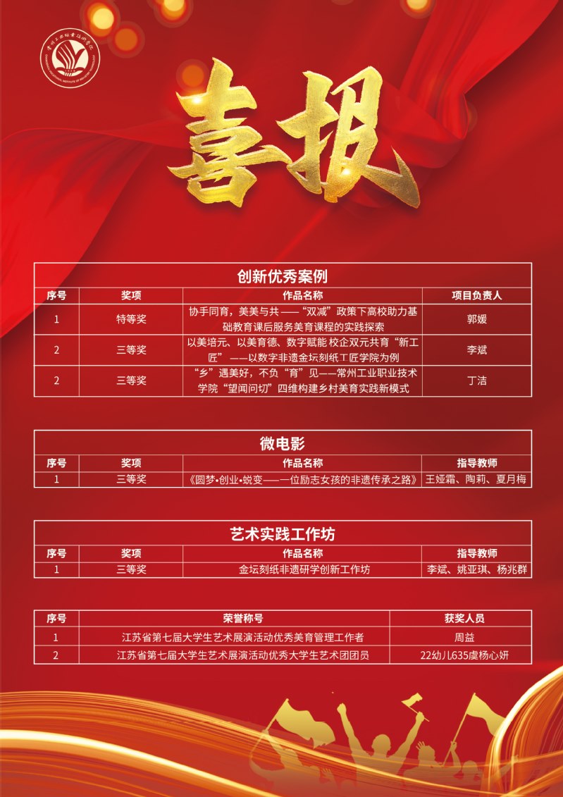 近日,江苏省教育厅公布了江苏省第七届大学生艺术展演活动获奖情况,常州工业职业技术学院获特等奖2项、一等奖2项、二等奖1项、三等奖12项,同时学校获评优秀组织奖,周益老师获评优秀美育管理工作者、旅游与康养学院2022幼儿635班虞杨心妍同学获评优秀大学生艺术团团员。