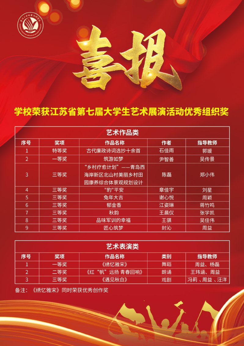 江苏省大学生艺术展演活动由江苏省教育厅主办,每三年举行一次,是江苏省规格最高、规模最大、参与面最广、影响力最大的大学生艺术盛会。本届大学生艺术展演活动以“厚植家国情怀,涵养进取品格”为主题,展演活动的项目分为艺术表演类、大学生艺术实践工作坊、艺术作品类、高校美育改革创新优秀案例四大类,涵盖舞蹈、声乐、朗诵、绘画、摄影、设计、微电影、书法等多个比赛项目。