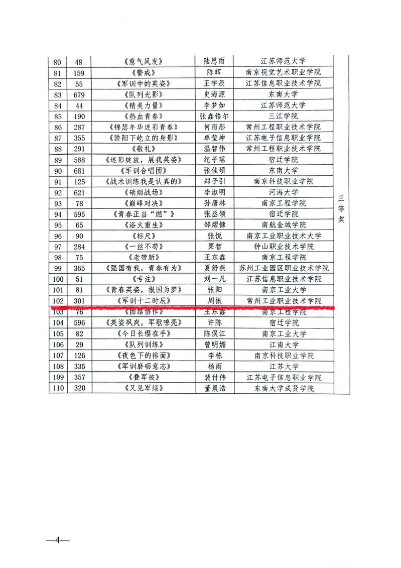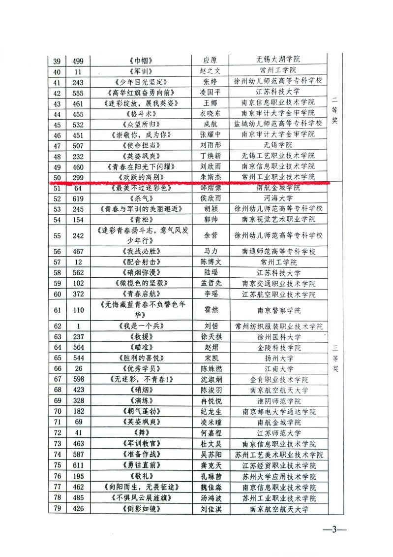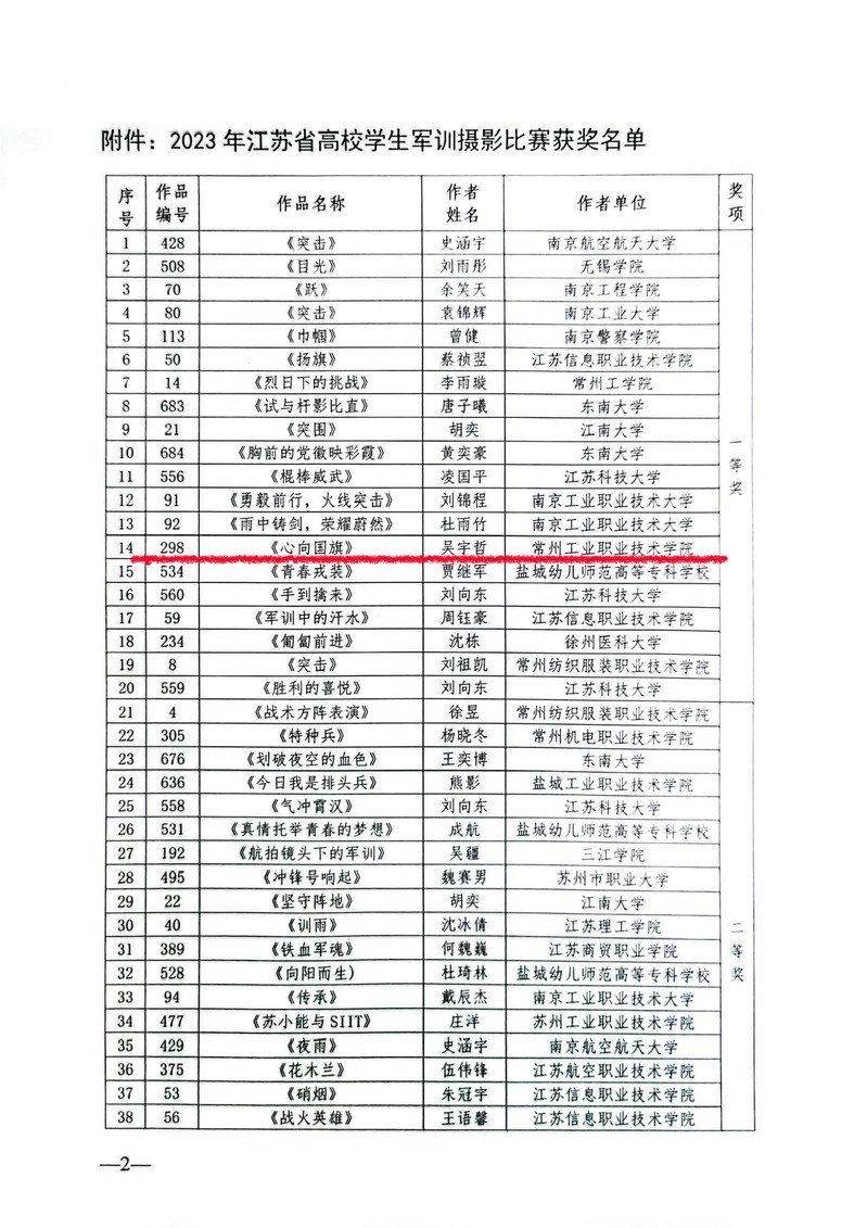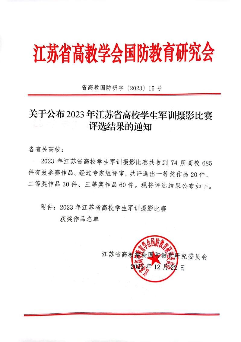 本次比赛由江苏省高教学会国防教育研究会主办,共收到74所高校685件有效参赛作品。经过专家组评审,选出一等奖作品20件、二等奖作品30件、三等奖60件。学校数字商务学院22国际商务532吴宇哲同学的摄影作品《心向国旗》荣获一等奖;数字商务学院22会计334班朱斯杰同学的摄影作品《欢跃的离别》获得二等奖;机械与交通学院周振老师的摄影作品《军训十二时辰》获得三等奖。