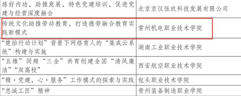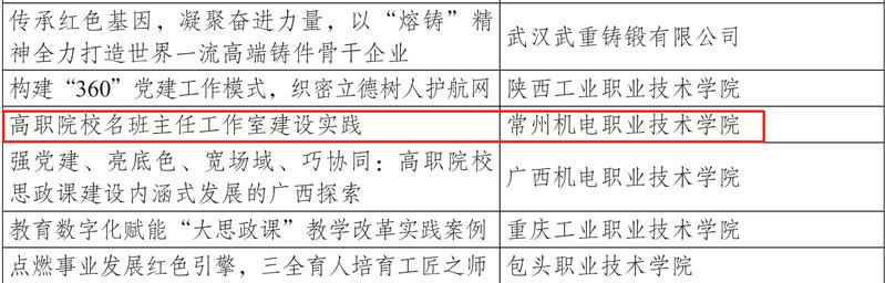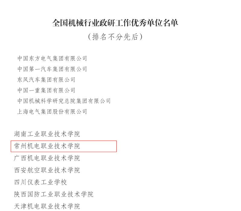 近日,中国机械工业职工思想政治工作研究会发布了2018—2023年度全国机械行业政治思想文化建设贡献榜、先锋榜和成果榜总榜单的决定。常州机电职业技术学院荣获全国机械行业政研工作优秀单位;学校教师李兵荣获优秀个人;“高职院校名班主任工作室建设实践”“传统文化助推劳动教育,打造德劳融合教育实践新模式”等2个案例分别入选全国机械行业政治思想文化建设创新成果二类成果奖和三类成果奖。