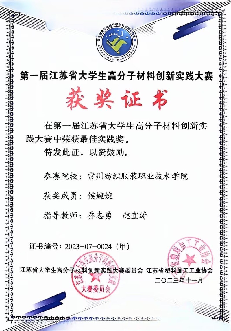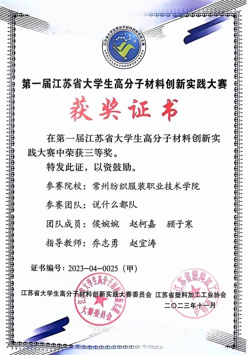 为进一步培养学生创新精神,提升学生专业综合实践能力,展示我校创新实践教育成果。日前 ,常州纺织服装技术学院高分子材料智能制造专业学生代表队参加了在江苏理工学院举行的第一届江苏省大学生高分子材料创新实践大赛。