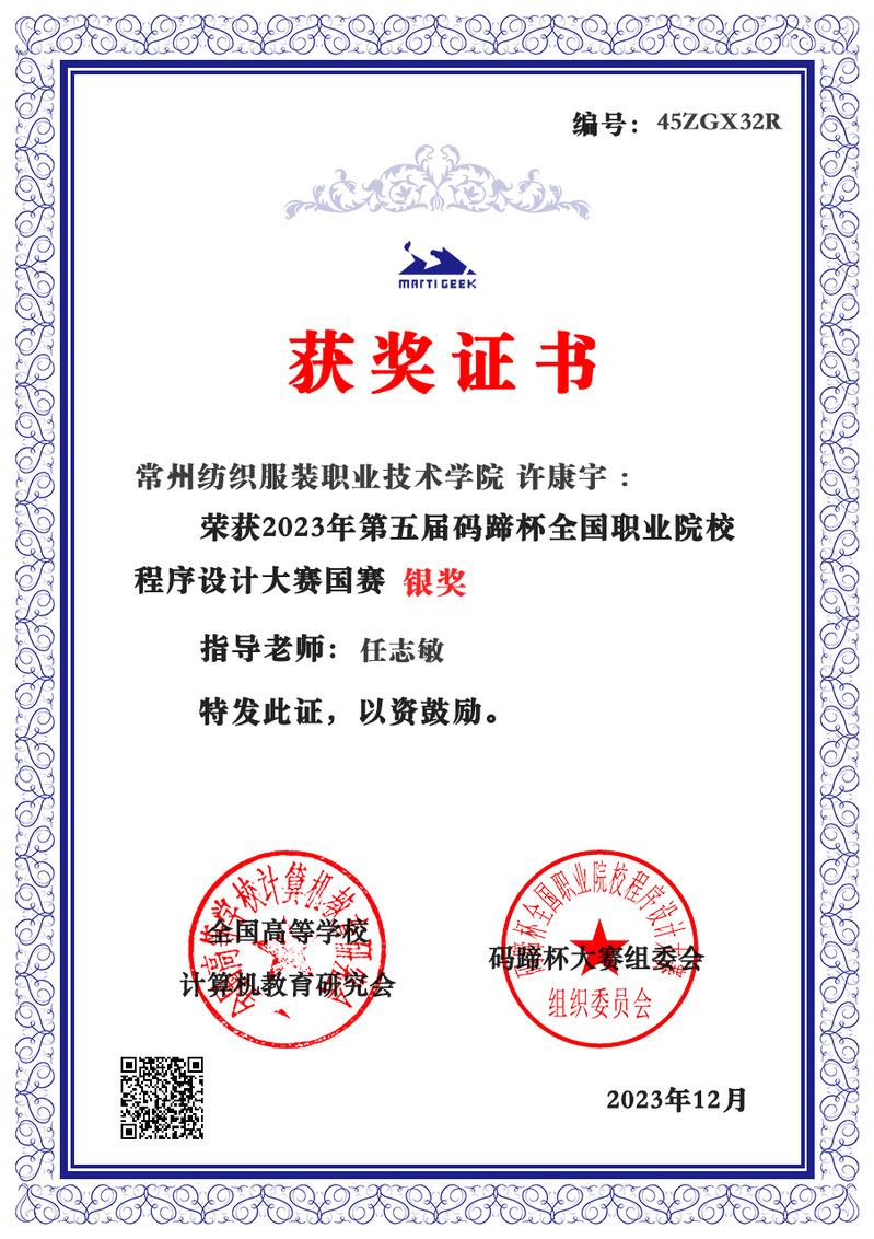 近日,2023年第五届码蹄杯程序设计大赛全国总决赛落下帷幕。经过省赛选拔,常州纺织服装职业技术学院的机电学院共有3名选手成功晋级决赛,并在总决赛中斩获1项银奖、2项铜奖,许康宇获得银奖,江佳辰,姜承孝获得铜奖。