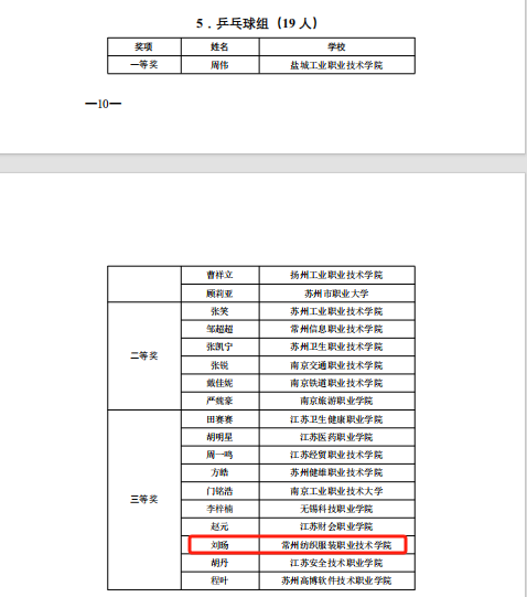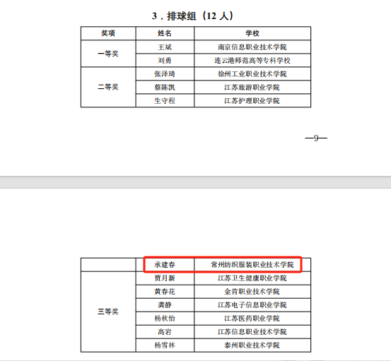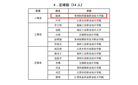 近日,江苏省第二届高校体育教师教学基本功比赛获奖结果公布,常州纺织服装职业技术学院体育部教师陆爽、承建春、刘旸在比赛中分别获得足球组一等奖、排球组二等奖和乒乓球组三等奖的好成绩,实现了学校体育教师在省级体育教学基本功比赛中的新突破。