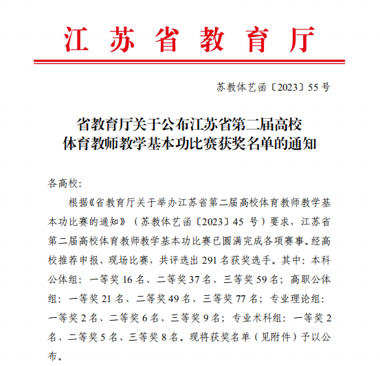 本次教学比赛由江苏省教育厅主办,江苏省高校体育教学指导委员会、南京工业大学(本科组)、南京信息职业技术学院(高职高专组)承办。高职院校公共体育组比赛于11月23日-25日在南京信息职业学院举办,全省高职院校共有192名体育教师参加,每位参赛教师需完成三项比赛内容:教学技能类,包括限时编写教案(手写)、12 分钟模拟上课;专项运动技能类;体育综合理论(包括教育学、体育心理学、学校体育学、急救教育等)。通过综合考核共评选出一等奖 21 名、二等奖 49 名、三等奖 77 名。
