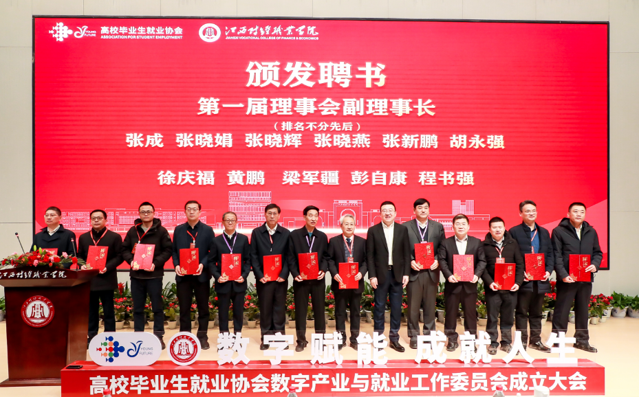 高校毕业生就业协会是由教育部主管、致力于大学生就业工作的全国性行业协会,经高校毕业生就业协会批准,决定成立数字产业与就业工作委员会。出席成立大会的领导和嘉宾有:教育部原党组成员、副部长张天保同志,高校毕业生就业协会会长王路江研究员,江西省政协常委、教科卫体委员会主任、二级教授郭杰忠同志,江西省财政厅党组成员、副厅长刘力群同志,江西省工业和信息化厅党组成员、副厅长江明成同志,九江市政府副市长、农工党市委会主委丁喜春同志,高校毕业生就业协会副会长许世杰同志,江西省教育评估监测研究院党委书记刘静俭同志,江西省就业创业服务中心主任郭锦亮同志,江西财经职业学院党委书记刘彪文教授,江西财经职业学院校长彭慧同志和来自全国150余所本专科院校、100余家企事业单位负责人。